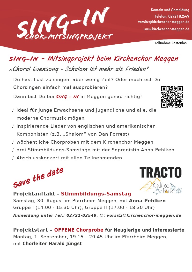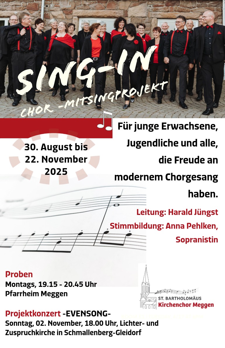 Mit dem neuen Mitsingprojekt SING-IN! startet der Kirchenchor Meggen in die Chorsaison 2025/26 – und lädt alle Singbegeisterten herzlich zur Teilnahme ein. Vom 30. August bis zum 22. November 2025 steht das gemeinsame Singen im Mittelpunkt – offen für junge Erwachsene, Jugendliche, und alle, die moderne Chormusik mögen. Das Chorprojekt wird von den Firmen Tracto-Technik und Galileo Park gefördert. Die Teilnahme ist kostenlos.
