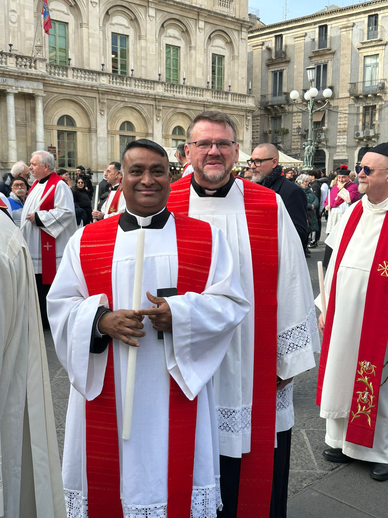 Eine Reise nach Sizilien lohnt sich – besonders zum Fest der heiligen Agatha. Für die Mitglieder unserer St.-Agatha-Gemeinde war die Teilnahme an den Feierlichkeiten in Catania ein tief bewegendes Erlebnis. Auch die kulturellen Entdeckungen in Palermo, Cefalù, Syrakus und Taormina sowie die Begegnung mit Bischof Giuseppe Marcante machten diese Reise zu einem unvergesslichen Erlebnis.