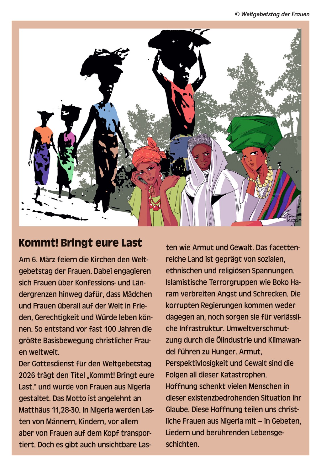 Am Freitag, den 6.3, feiern Menschen in über 150 Ländern der Erde den Weltgebetstag der Frauen aus Nigeria. „Kommt! Bringt eure Last.“ lautet ihr hoffnungsverheißendes Motto, angelehnt an Matthäus 11,28-30.