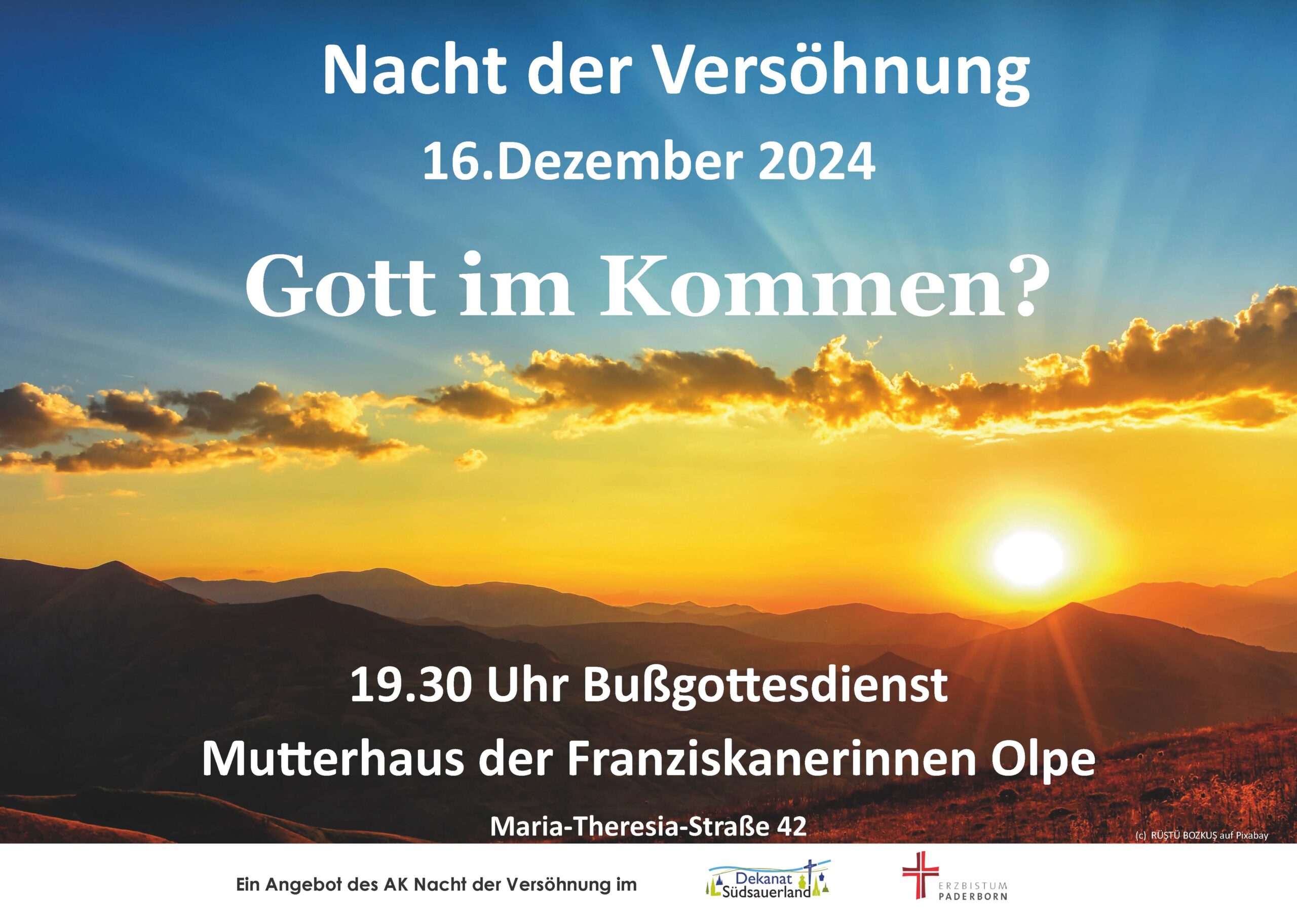 Mit diesem Gottesdienst endet auch eine andere Wartezeit: Die Nacht der Versöhnung kehrt nach der fast abgeschlossenen Umbauphase wieder ins Mutterhaus der Franziskanerinnen Olpe zurück. Der Bußgottesdienst um 19.30 Uhr wird, wie gewohnt musikalisch von der Gruppe Horizont begleitet. Im Anschluss besteht die Möglichkeit, einen Einzelsegen zu empfangen oder ein Beicht- oder Lebensgespräch zu führen. Im Flurbereich vor der Kirche sind alle Teilnehmenden herzlich eingeladen, bei Tee und Gebäck der Schwestern miteinander ins Gespräch zu kommen und sich auszutauschen.